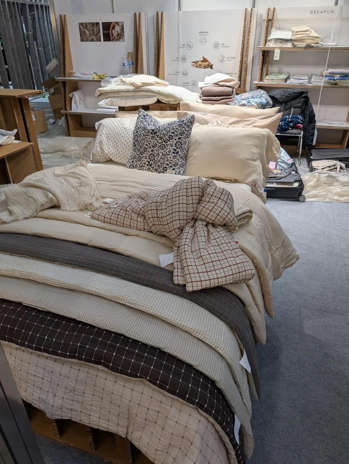 This bedding display presents our fabrics in a real-use setting, showing drape, hand-feel and colour coordination in home environments.